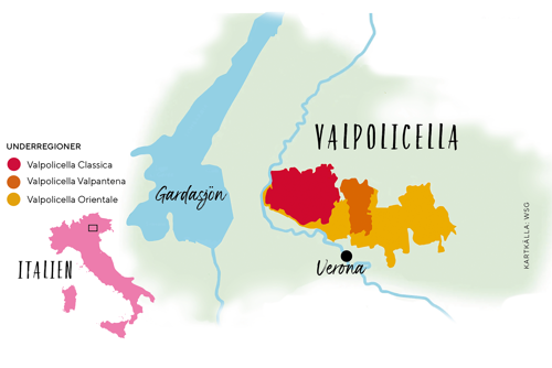 Läge: Valpolicella ligger i provinsen Verona, öster om Gardasjön.